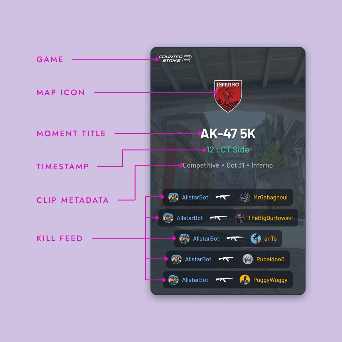 Instead of waiting for a gamer to seek out their clips, I designed a way for Allstar to stay one step ahead. By leveraging real-time match data, the platform could spot a high-impact play the moment it happened. This shifted the burden of discovery from the user to the platform. The goal was to transform Allstar from a manual tool into a personal digital editor that delivers value proactively.