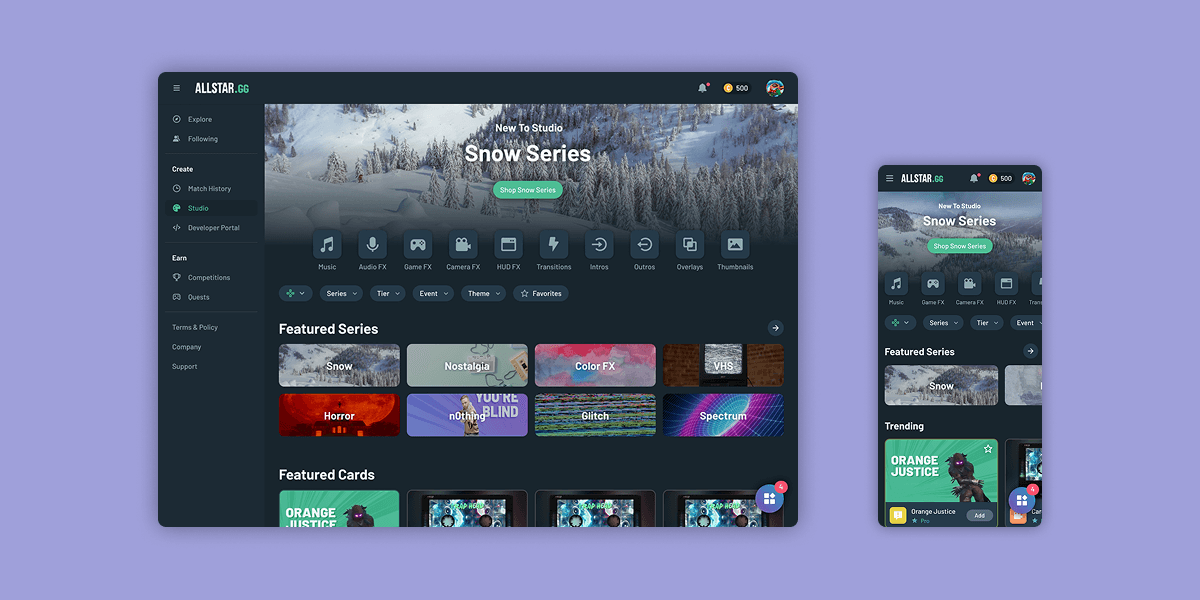 Studio is Allstar's creative engine for gamers. Instead of using traditional editing timelines, users apply "Creator Cards" to their gameplay clips. Each card represents a specific visual or audio effect that users can easily add to their creation flow. Once active, these cards do the heavy lifting—automatically detecting and syncing effects to in-game events like kills or wins.