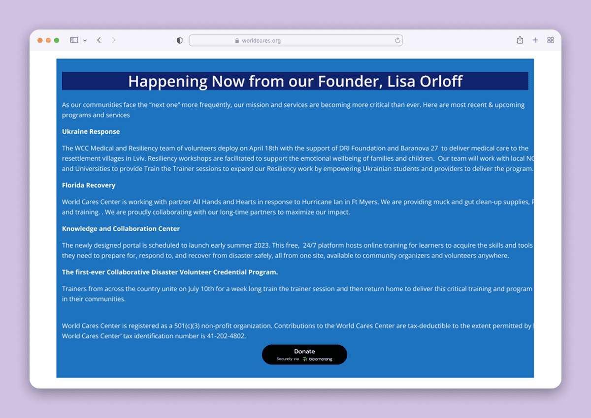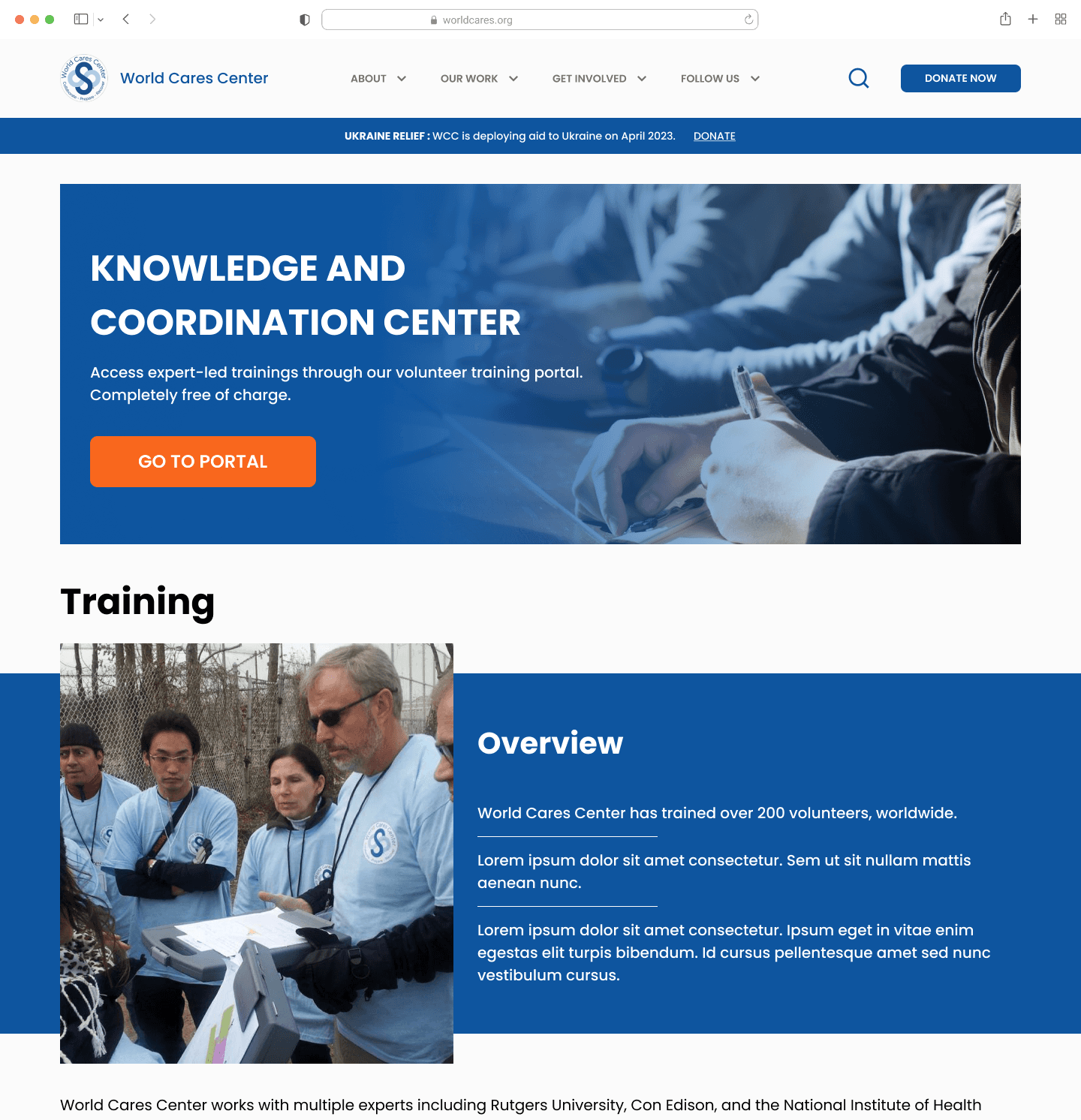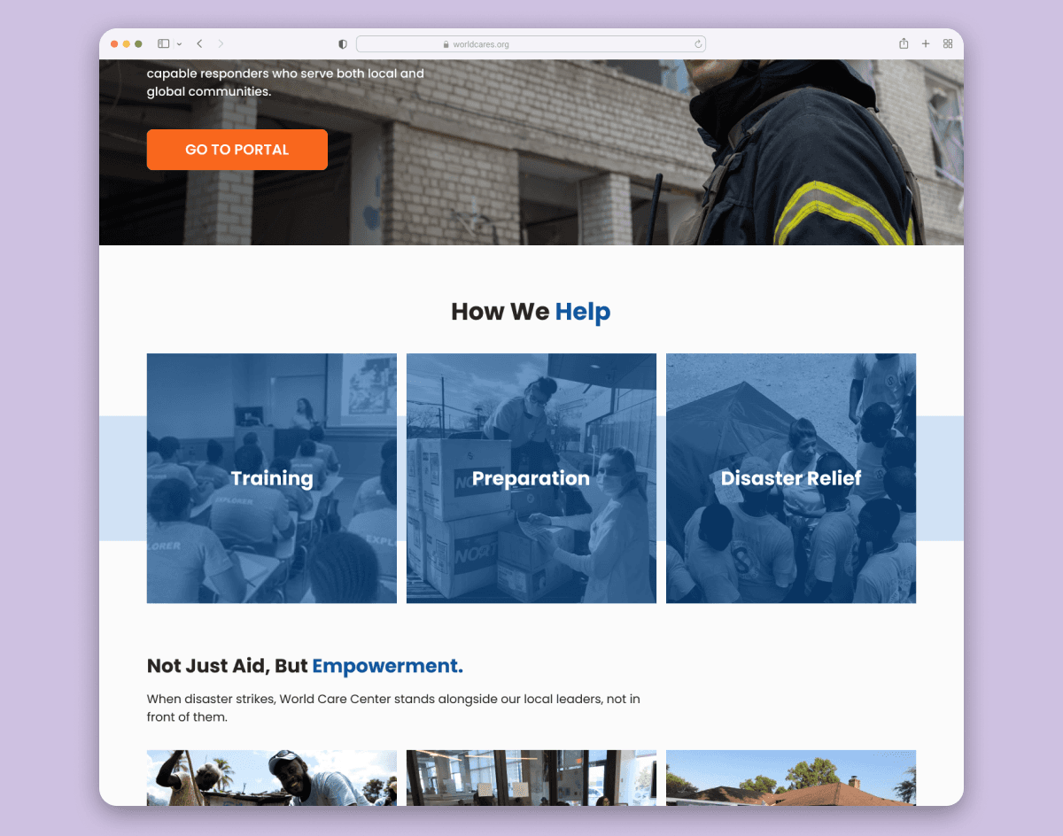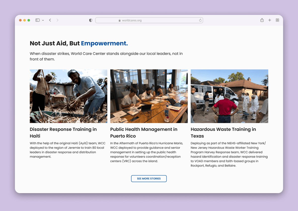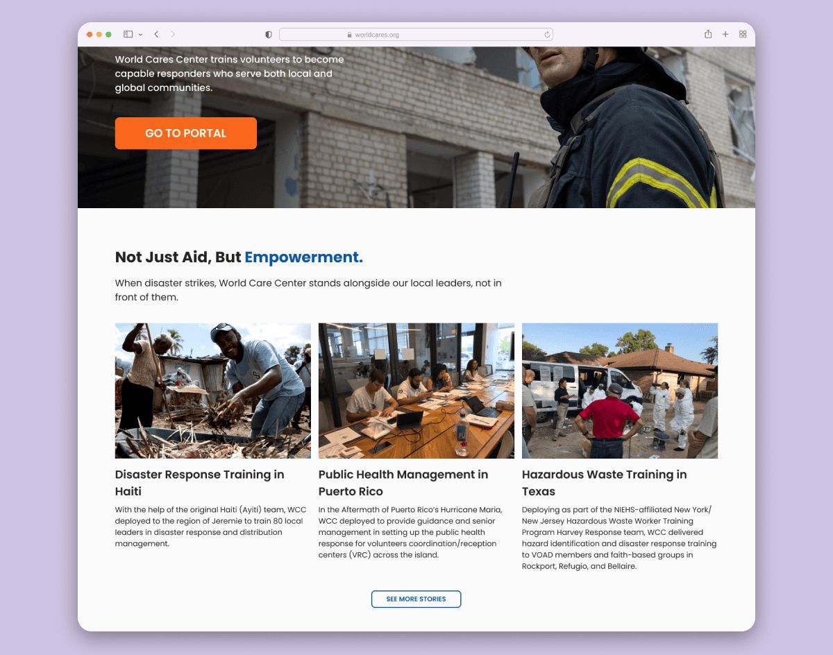 World Cares Center is a nonprofit that provides training, supplies, and relief to disaster stricken communities. When I joined the project, the organization's website was barebones, running solely with the help of volunteer developers and graphic designers.