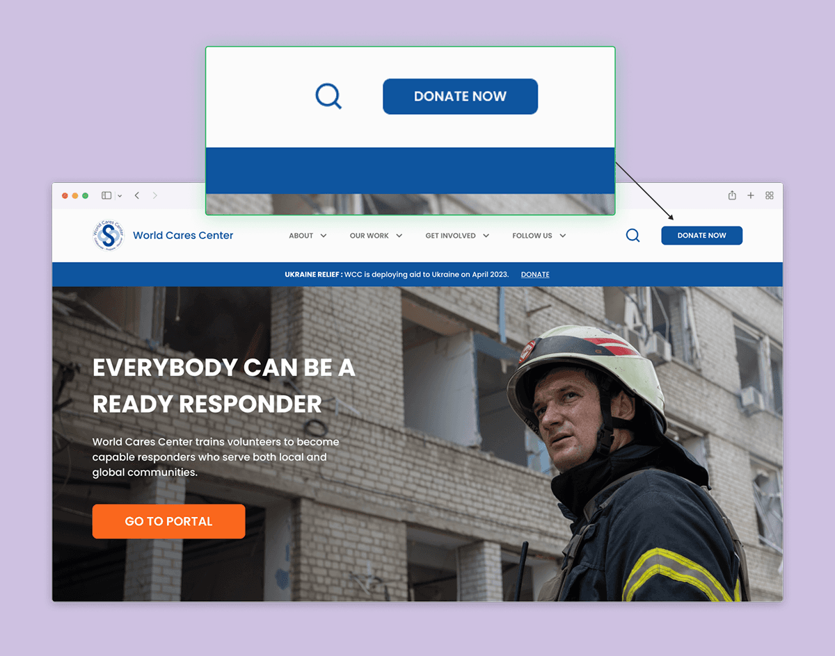 I created a "donate now" button that stood apart from the other items in the navigation bar. Additionally, a "go to portal" button was added to the hero banner on the homepage.