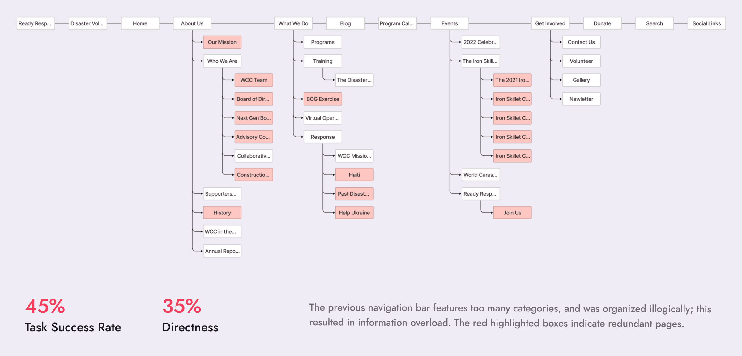 The 3 main actions that World Cares Center wanted its users to achieve were: signup as a volunteer, make a donation, and learn more about the organization. Users found all three actions were difficult to accomplish.