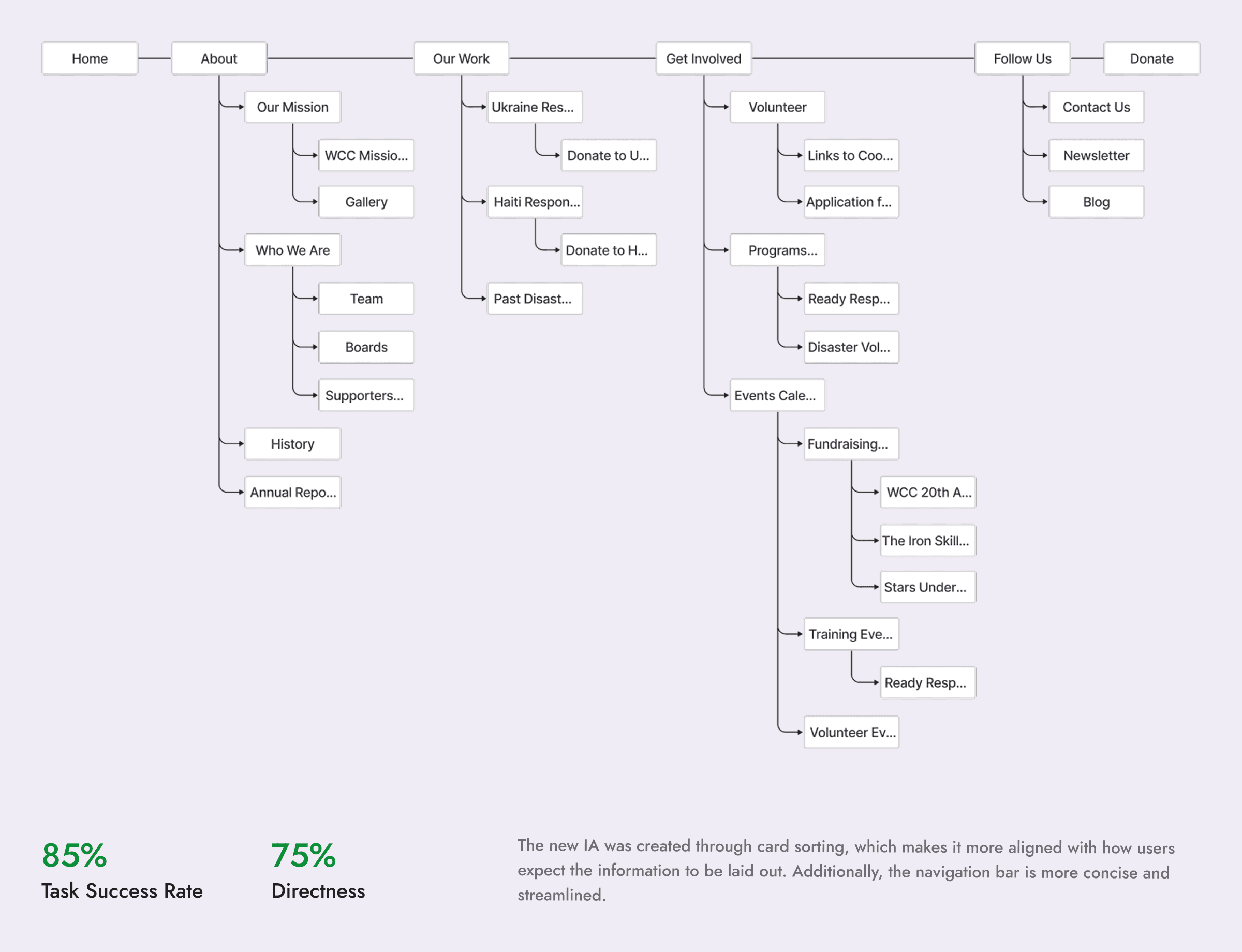 In order to develop an information architecture that aligned with users mental models, I conducted a hybrid card sorting exercise with 10 participants. Then I tested my new IA against the old one using an A/B tree test with 10 unique participants for each side.