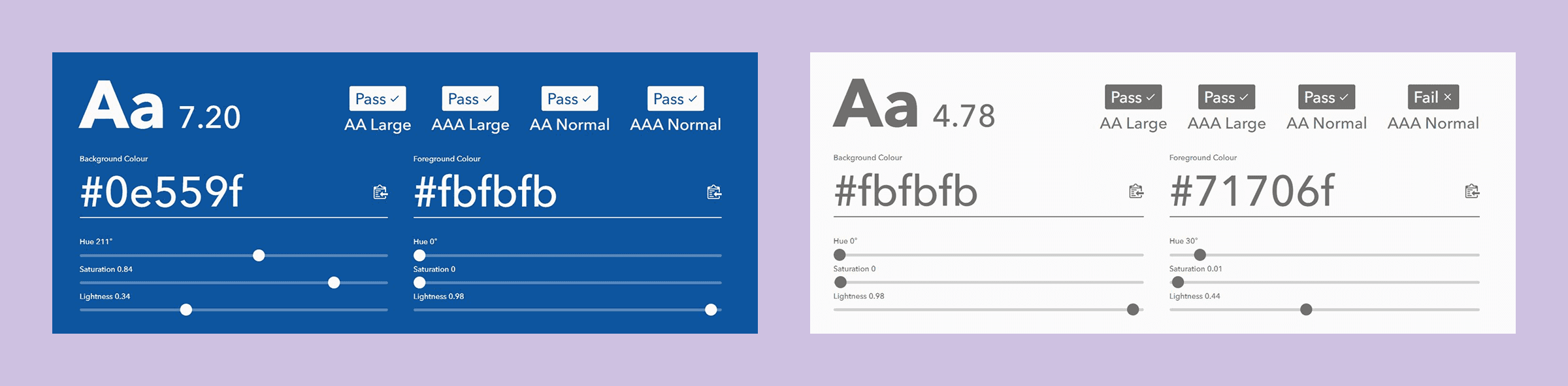 To design for accessibility, text and background colors should have a least a WCAG AA rating (4.5:1 for normal text).